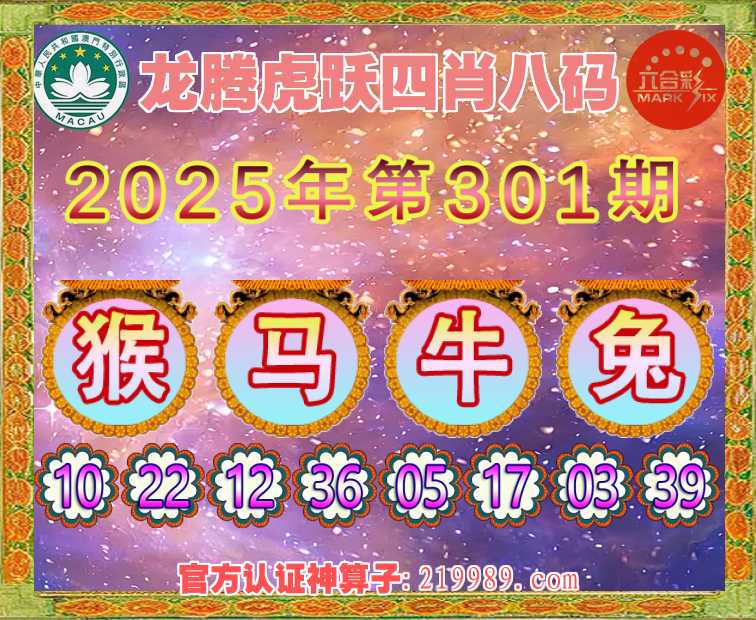 301期:『龙腾虎跃』 🎖️四肖八码🎖️【猴马兔】开:牛05