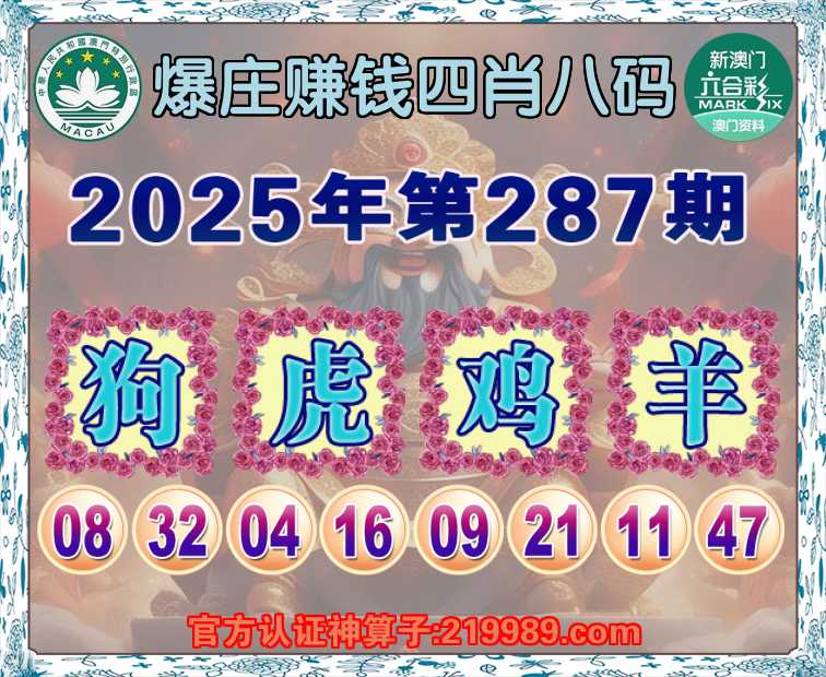 287期:『爆庄赚钱』 🚲四肖八码🚲【狗虎鸡羊】开:猴34
