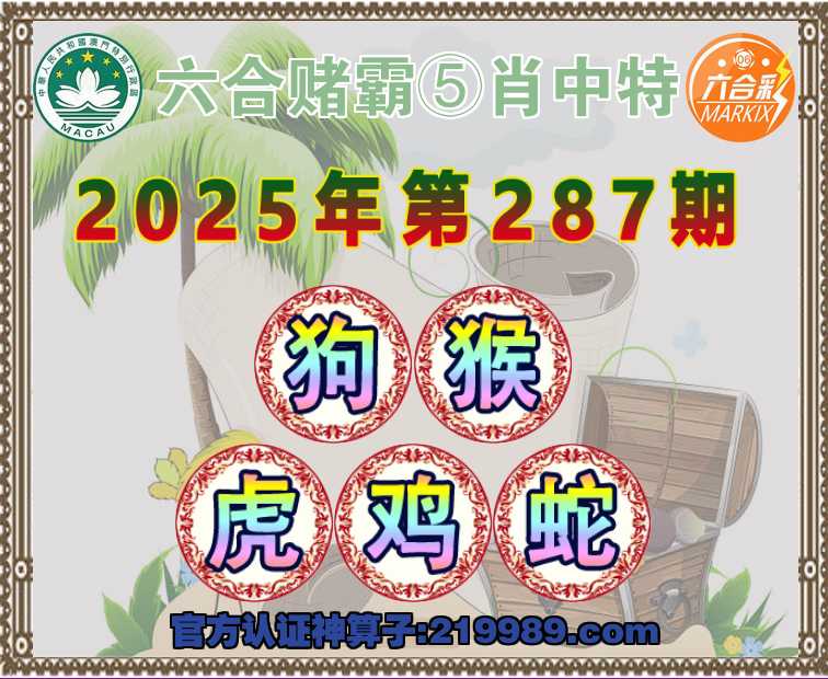 287期: ☝️『六合赌霸』 ☝️⑤肖中特☝️【狗..虎.鸡.蛇】开:猴34